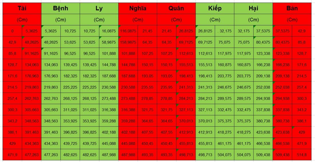 Thước lỗ ban 42,9cm (vùng màu đỏ là tốt, màu xám là xấu)